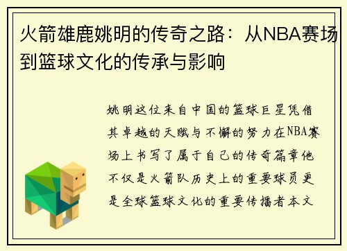 姚明作为中国篮球界的传奇人物,不仅在体育领域取得了辉煌成就,还积极投身于文化和艺术的传承与创新。苏州传统工艺以其精湛技艺和悠久历史闻名于世,而姚明携手这一传统工艺,旨在推动其文化价值的重塑与再生。在这篇文章中,我们将从四个方面详细探讨姚明如何通过自身影响力,助力苏州传统工艺的传承与创新,包括对传统工艺的认知、文化交流的重要性、现代科技的应用以及未来发展的展望。最终,我们将总结姚明与苏州传统工艺合作...